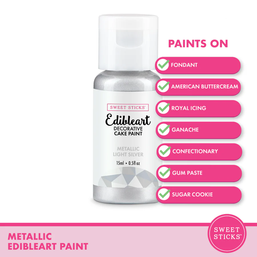 Sweet Sticks Metallic Edible Art Paint is the perfect way to add a little bit of shimmer to your delicious creations. The paint is ready to use straight from the bottle, so there is no need to mix it with any other ingredients. Once applied and dried the pigment is sealed within the surface – no dust or smudges!