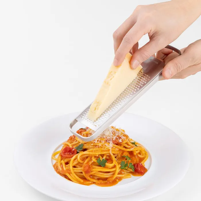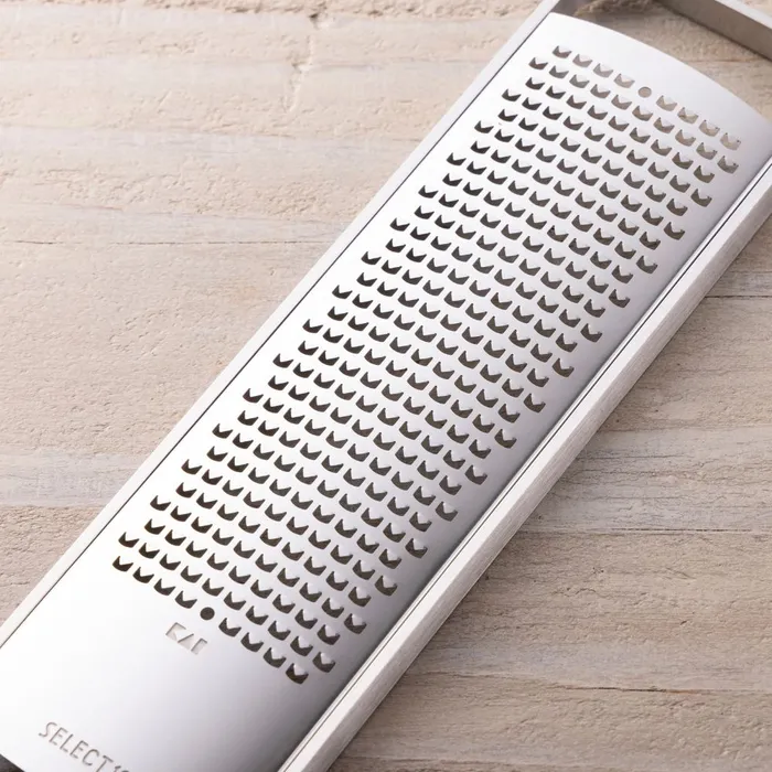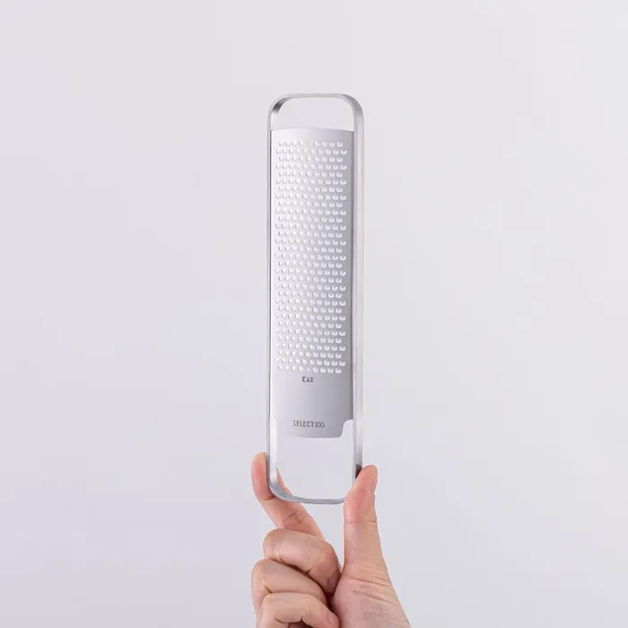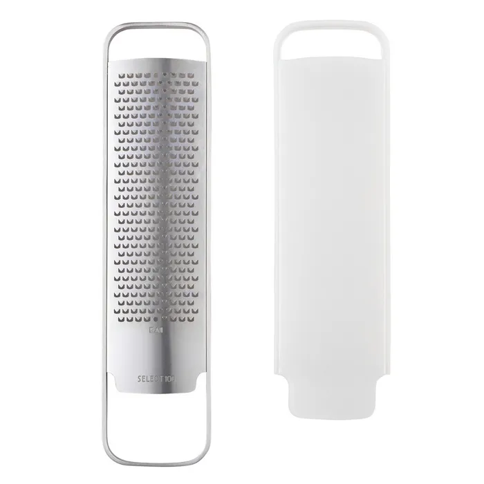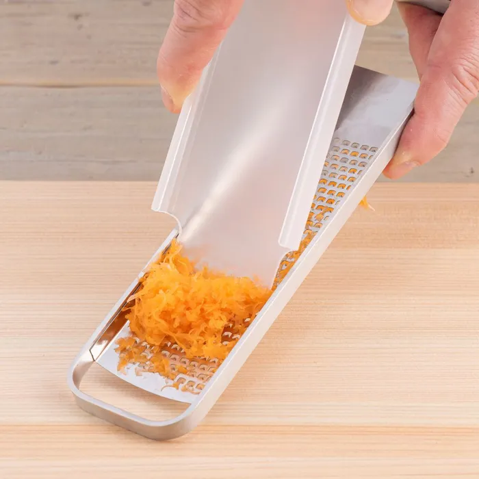 Compact design for easy storage. Used to grate hard cheese, ginger, citrus, and other foodstuffs. Garlic can be coarsely grated.